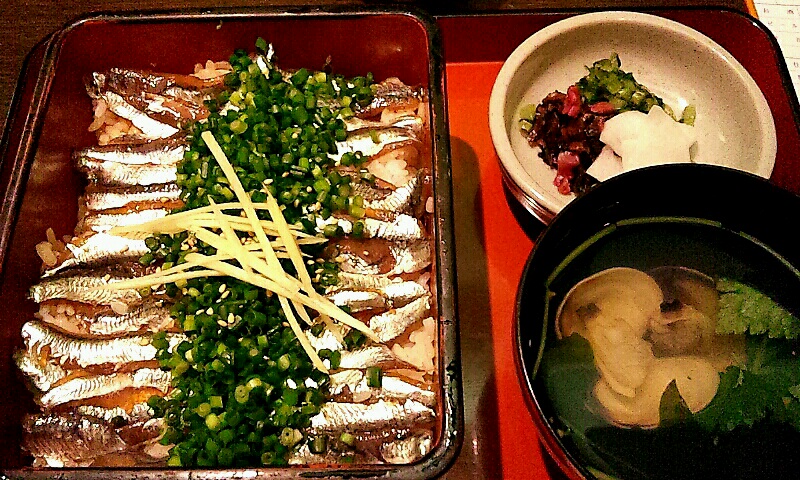 僕が注文した「小いわし丼」は、丁寧に捌かれ甘辛の醤油に漬け込まれ旨そうに身を飴色にして、皮は眩しい銀色に輝き散らされたタップリの青ネギとのコントラストが如何にも旨そうです。