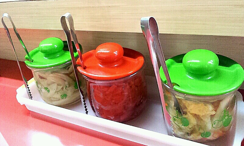 そして、このお店の薬味は、福神漬けの他に自家製の玉葱の酢漬けとキャベツの酢漬けの3種類がカウンターに用意されていて取り放題。