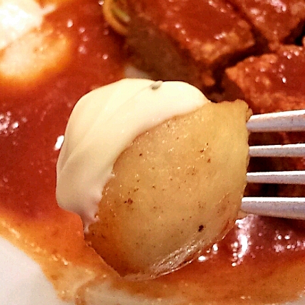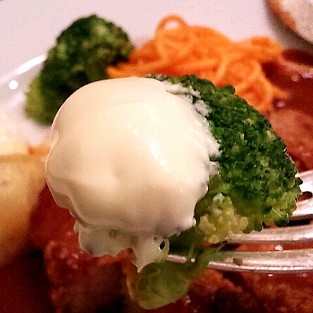 付け合せは、付け合せの王道で殿堂入りしちゃう感じのケチャップ味で炒めたスパゲティに、茹でたブロッコリと茹でたジャガイモで、ブロッコリ用に、そんなにいらないよぉ~というくらいマヨネーズを付けてくれます。