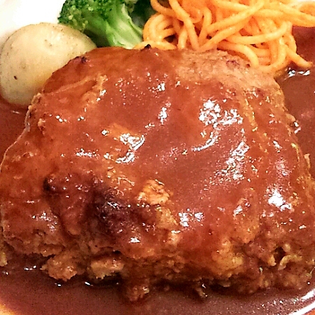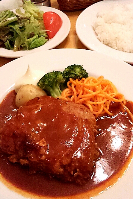 このお店のハンバーグは、ちょっと変わっていて、製作工程を推定するに、仕込みの時にフライパン一面を埋め尽くしてしまうんじゃないか…と言うほどのでっかいハンバーグをフライパンで焦げ目をつけたら、オーブンでじっくり焼き上げてから、適度な大きさに切り分けストックしておき、注文が入ると温め直して、付け合せの盛り付けられた皿に盛り付け、デミグラスソースをたっぷりかけてくれるタイプで、デッカクて分厚くて重量300gはありそうな大きなハンバーグで、ご飯もガッツリ行けちゃいます。