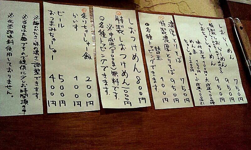 メニューを見ると塩ラーメンを前面に出したお店のようで、塩味以外は煮干醤油と濃厚鶏で、メニューは結構シンプルな構成です。