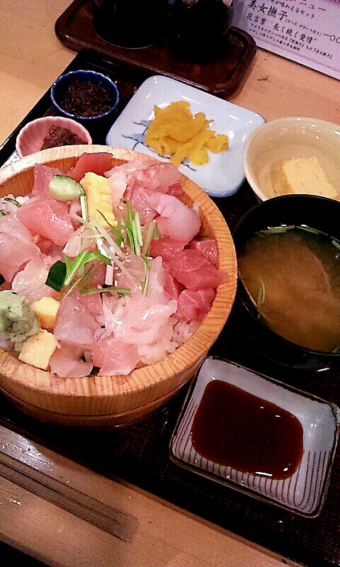 おまぜ丼の具は、マグロ、ハマチ、タイなど赤身の魚より白身の魚が多い感じで、バラチラシに入っていることが多い貝類は見当たりませんでしたが、具の鮮度や品質は、なかなか良いもので、形が不揃いなところをみると、仕入れを無理せず刺身を引いたり魚を捌いてサク取りした後の端材を無駄にしないで生で出せるものは生で出して使って、ランチの割安感を広告に使おうとしてるな…って感じで好感が持てますね…