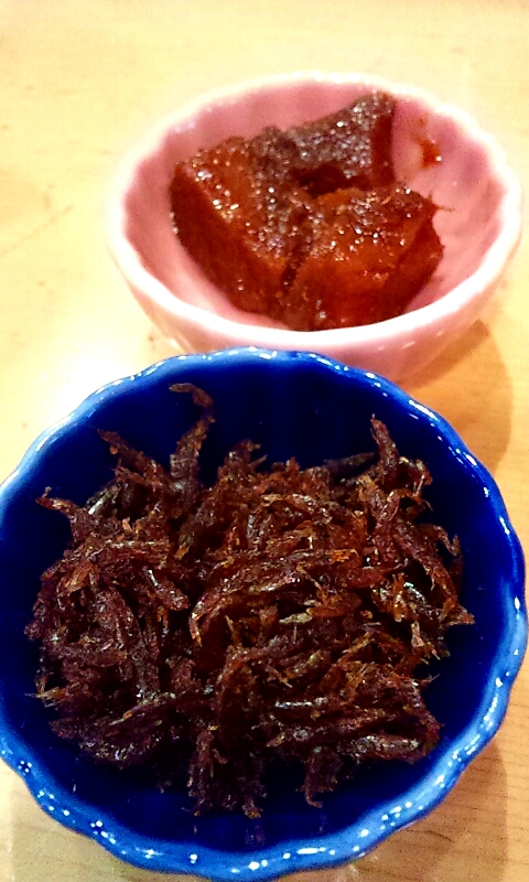 注文を終えると配膳担当のオバチャンが小皿の一杯入った籠を持ってきて、3種類の中から2種類お好きなものをお選びください…と昆布・あみ・マグロの佃煮から二品を選ぶように勧められます。