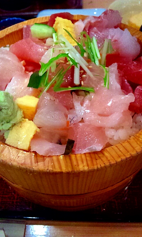 登場した「おまぜ丼」はバラチラシというには彩が寂しいように感じますが・・・小さめの桶にたっぷり入った具材と酢飯はボリューム感を感じさせます。
