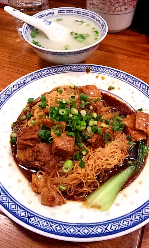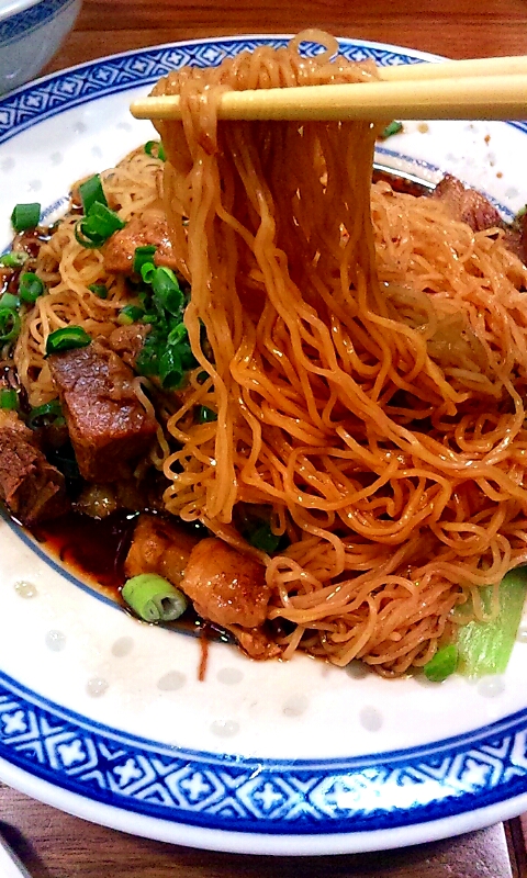 興味を惹かれた香港麺は、見た目ビーフンのような極細麺で見た目は頼りなさそうですが食べてみると意外と歯ごたえがあって、しっかりした食感。