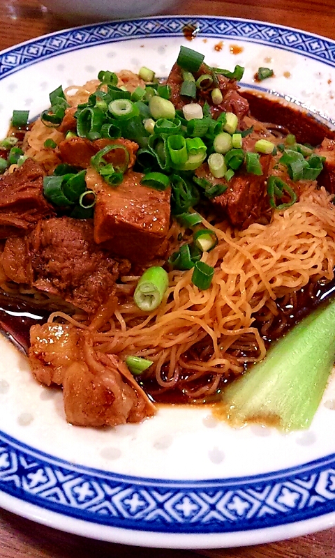 登場した「牛バラつゆなし麺」はつゆなしと言っても皿に醤油ベースのタレが注がれていて、そこに麺を入れ、醤油味に柔らかく煮込んだブロック状の牛バラ肉と青梗菜、青ネギをトッピングしたもの。