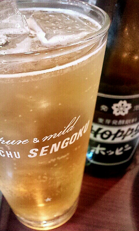 とりあえず、カウンターの一番端っこが空いていたので、そこにお邪魔して「ホッピー」450円を注文します。