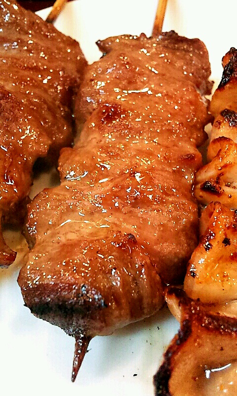 先ずは、ホッピーにお店の看板目メニューの焼肉2本で280円とホルモン2本で280円