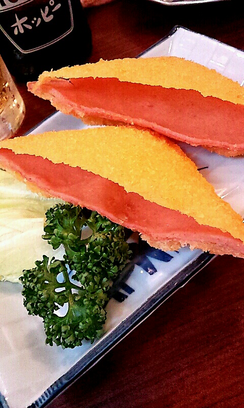 ハムカツはパリッとした薄衣に薄いハムが何とも大衆酒場なムードで、懐かしい味わいです。