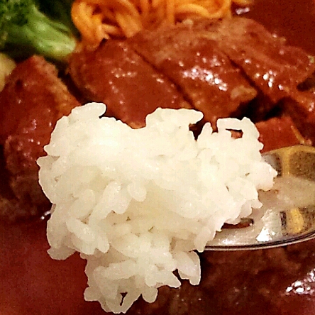 このお店のハンバーグは、ちょっと変わっていて、製作工程を推定するに、仕込みの時にフライパン一面を埋め尽くしてしまうんじゃないか…と言うほどのでっかいハンバーグをフライパンで焦げ目をつけたら、オーブンでじっくり焼き上げてから、適度な大きさに切り分けストックしておき、注文が入ると温め直して、付け合せの盛り付けられた皿に盛り付け、デミグラスソースをたっぷりかけてくれるタイプで、デッカクて分厚くて重量300gはありそうな大きなハンバーグで、ご飯もガッツリ行けちゃいます。