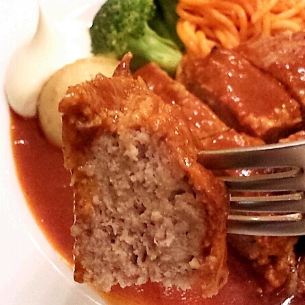 切り分けて口に頬張ると、ふんわりというよりも、ネットリとした食感で柔らかく昔ながらの懐かしい味わいのあるハンバーグです。