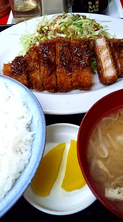この値段で余所の店で食べたら、業務用食材メーカーの脂臭い、脂身のようなプヨプヨの肉が入った何ともチープで食えたもんじゃない見た目だけの冷凍品を適当に揚げて出してる店が多いけど、この店は赤身の豚肉を使っているので、結構歯ごたえがあるけど…ちゃんとした手作りのとんかつです。