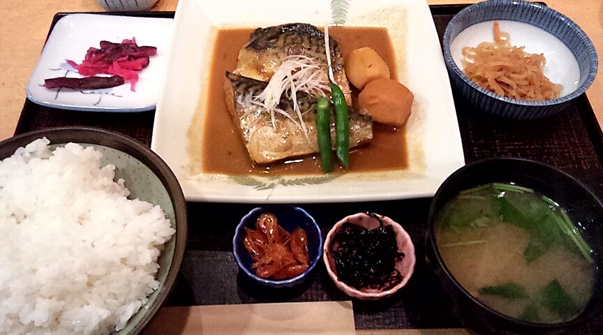 このお店、いまどきランチでもタバコが吸える貴重なお店なので、ホール係のお姉さんに「鯖味噌って時間かかりますか?」と聞くと、「煮付けてから一晩寝かして味をなじませるので温め直しの時間をいただくくらいですから焼き魚より待たないと思います」と説明を受けたので、日替わりの「鰆の塩麹漬け焼き」も興味があったけど、「生から炭火で焼くので焼き時間に15分くらいかかります」と言われていたので「鯖の味噌煮定食」に決まりです。