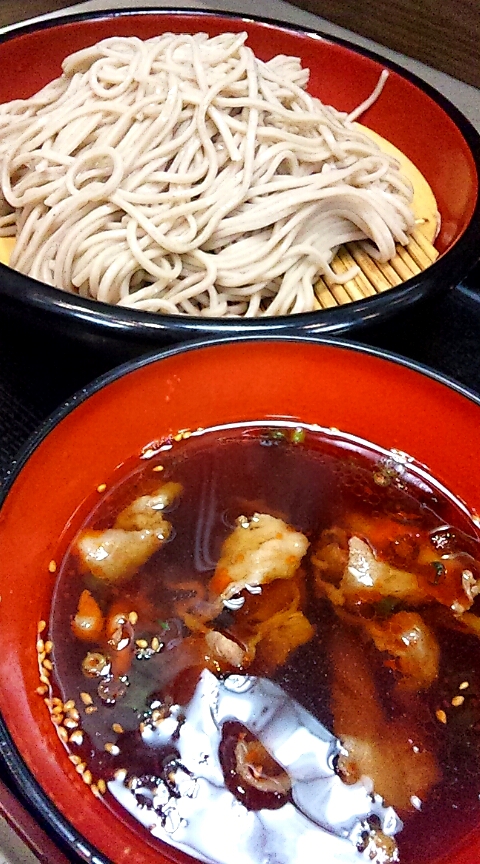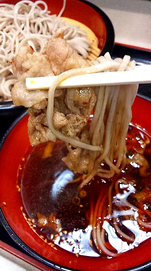 甘辛く炊いた豚肉入りでラー油で辛味を加えたそばつゆにそばを付けて食べるスタイル。