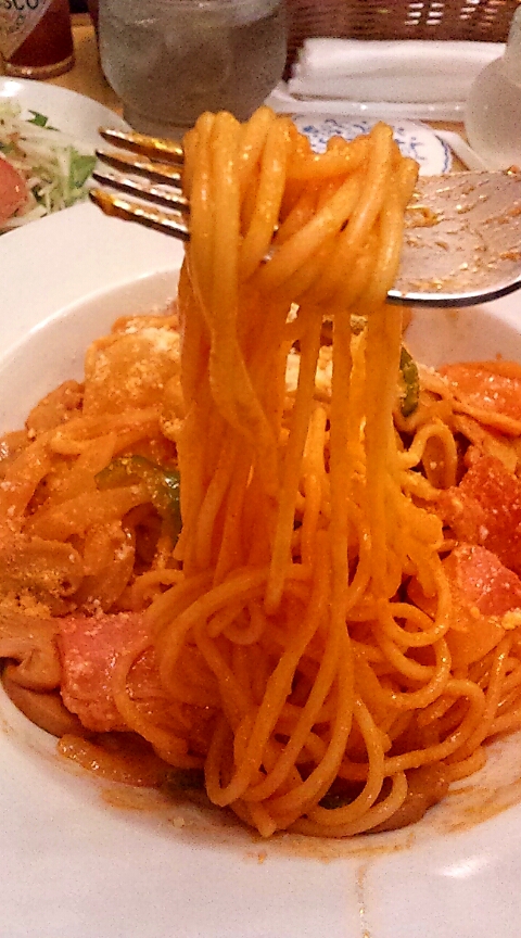 茹で置きで、ちょい軟のの、やや太めなスパゲティーにベーコン、玉ねぎ、ピーマン、マッシュルームをトマトケチャップで炒めた説明の必要がないほど正しい喫茶店のナポリタンで、いい感じです。