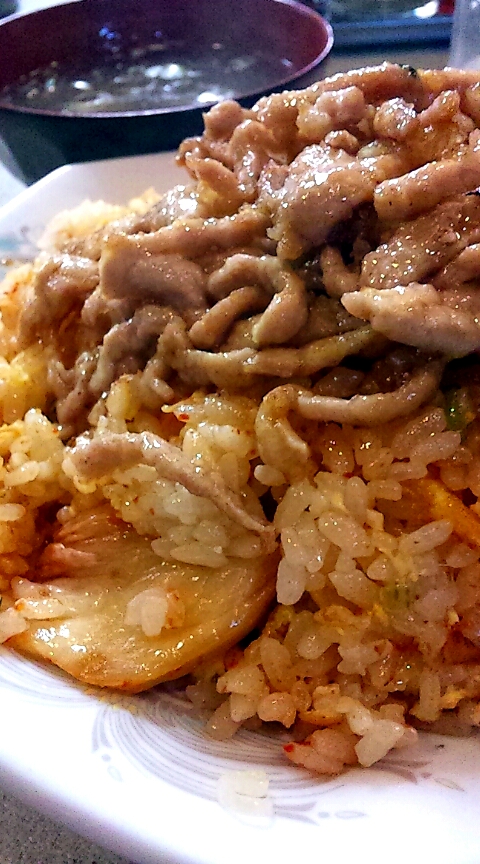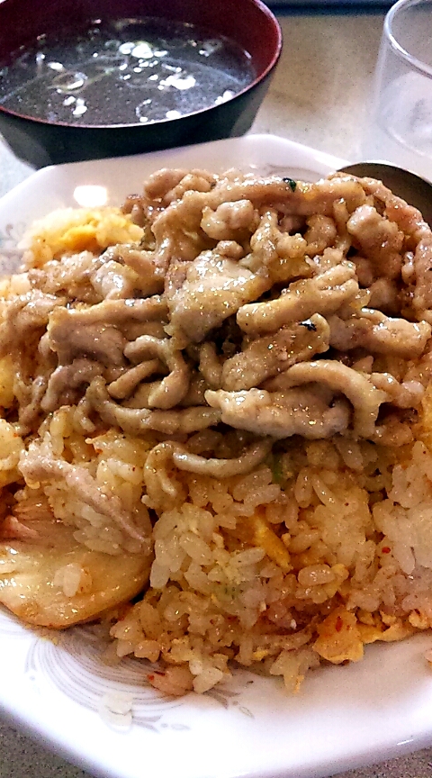お店自家製の本格派のキムチも程よい辛さに程よい酸味でチャーハンの旨味をよく引き立てながらもしっかり自己主張してるし、トッピングされたチンジャオロースをやや甘辛くしたような味付けの豚肉の細切りも、ピリ辛のチャーハンとの相性も抜群で、無心になって口に運んでしまいます。