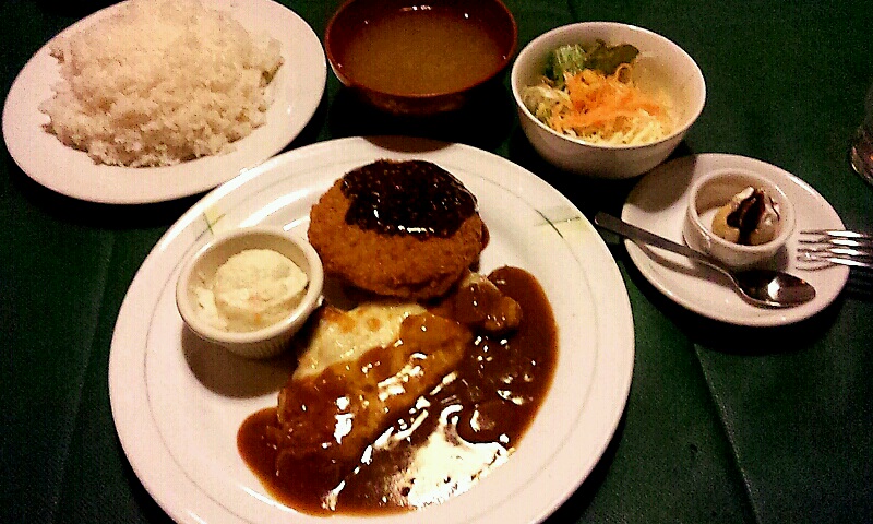 食べたメニューは、営業君が、日替りパスタの「ミートソースのクリームパスタ」850円で、僕は、日替りランチ「豚肉とポテトのチーズ焼と厚切りハムカツ」900円で、ともに大盛。