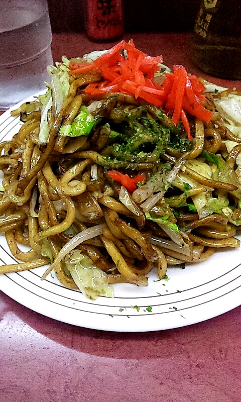 肉なし焼きそばって感じのチープな見た目ですが、麺は平打ちに近く柔らかくウエーブのかかったコシの強いお店オリジナルの独特な麺で、肉は入っていなくとも動物性油脂の旨味も加えられていて、なかなか旨いんです。