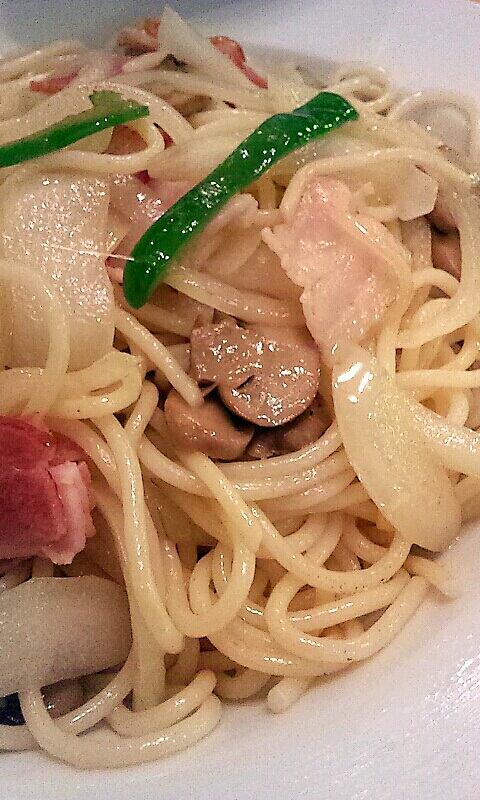 登場した「カレースパゲティ」は、妄想の後者に近い状態をお店で出すのに、ちょっとだけ、よそ行きっぽく、カレールーをソース用の器に注いで優しい塩味に味付けされたベーコン、玉葱、ピーマン、マッシュルームの具入りスパゲティに添えられてます。